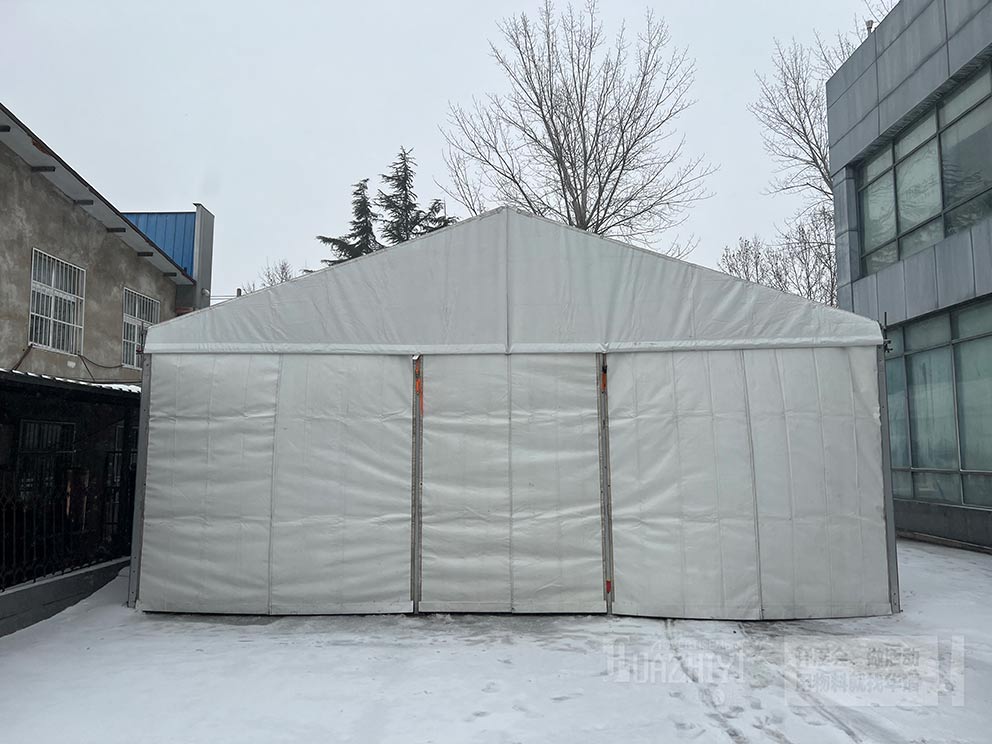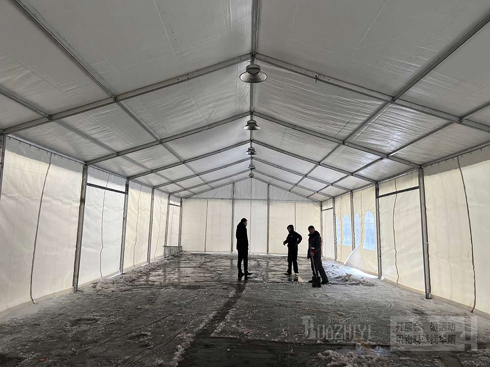 華之熠篷房的篷布是有保溫材料的,可以阻擋一部分寒冷空氣,同時(shí)建議您配備上取暖設(shè)備,正常開啟暖風(fēng)機(jī)或空調(diào)的情況下,在雪天,篷房頂部也不會(huì)有太多積雪,也能夠進(jìn)一步提高室內(nèi)溫度,確保篷內(nèi)工作人員可以感受到溫暖和舒適。