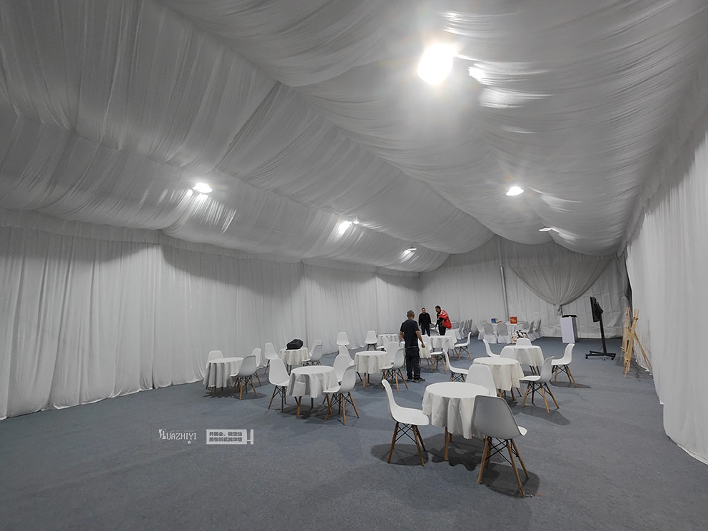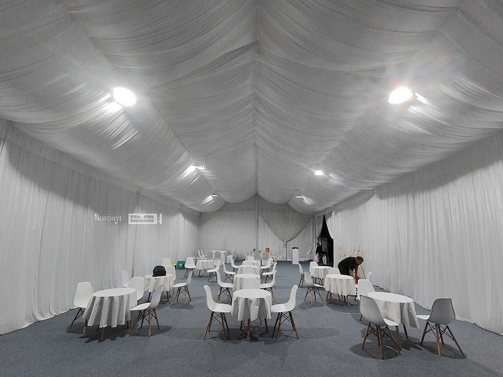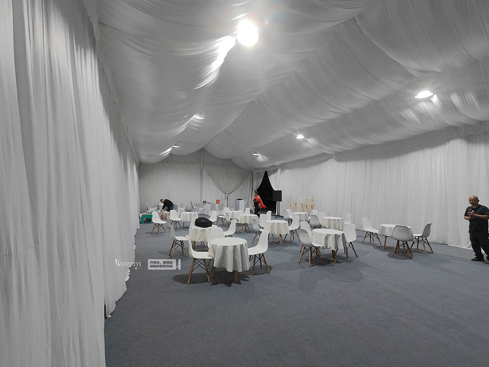 步入篷房,內(nèi)部布置更顯精致。頂部懸掛的米白色帷幔層層疊疊,既劃分出功能區(qū)域,又增添了空間的縱深感。休息區(qū)擺放著駐馬店篷房出租公司的白色伊姆斯桌椅,圓潤(rùn)的椅身包裹著細(xì)膩面料,坐感柔軟卻不失支撐;桌面鋪著同色系桌布,原木色桌腿則注入自然暖意,中和了白色調(diào)的清冷,讓科技感十足的試駕會(huì)多了份居家般的松弛。