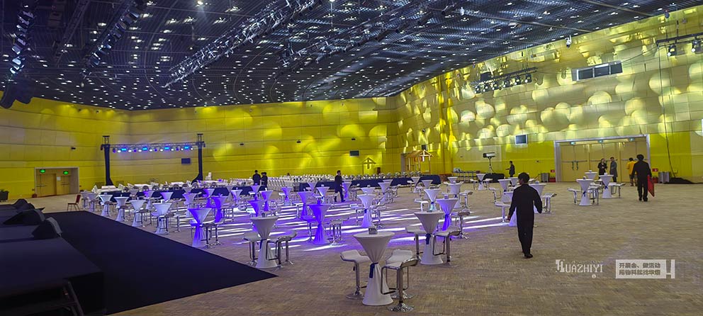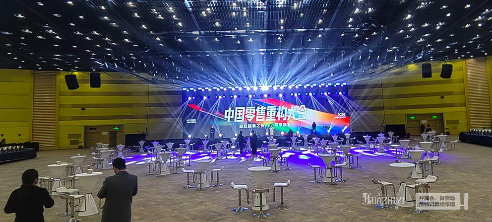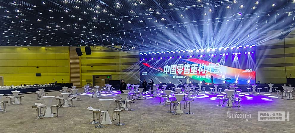 吧桌采用簡約流線型設計,桌面平整寬敞,材質耐磨易清潔,完美適配商務場景;吧椅造型輕盈舒適,久坐不累,高度與吧桌精準匹配,既保證了坐姿的舒適感,又不占用過多空間,讓有限區(qū)域容納更多交流互動可能。同時,統一的簡約色系與精致質感,與大會高端商務氛圍高度契合,成為會場中低調卻亮眼的存在,為整體空間質感加分。高效的布置離不開專業(yè)的執(zhí)行團隊。鄭州華熠團隊提前進場勘測場地,結合大會動線規(guī)劃與區(qū)域功能需求,制定詳細的擺放方案。
